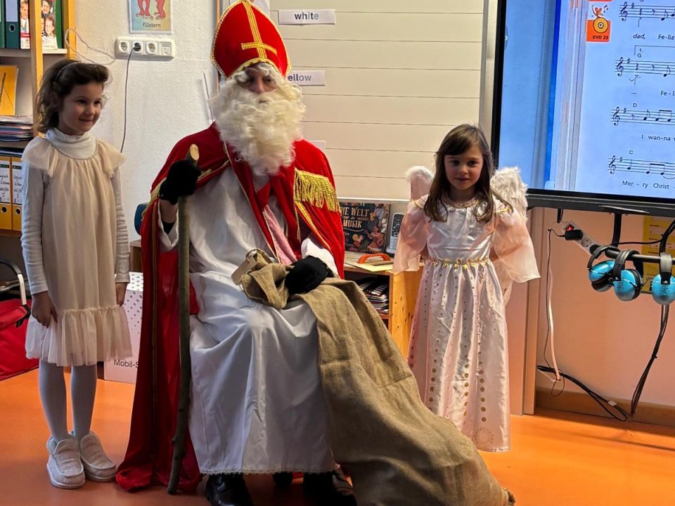 Der „Heilige Nikolaus“ mit Engeln zu Besuch an der Franziska-Hager-Grundschule in Prien